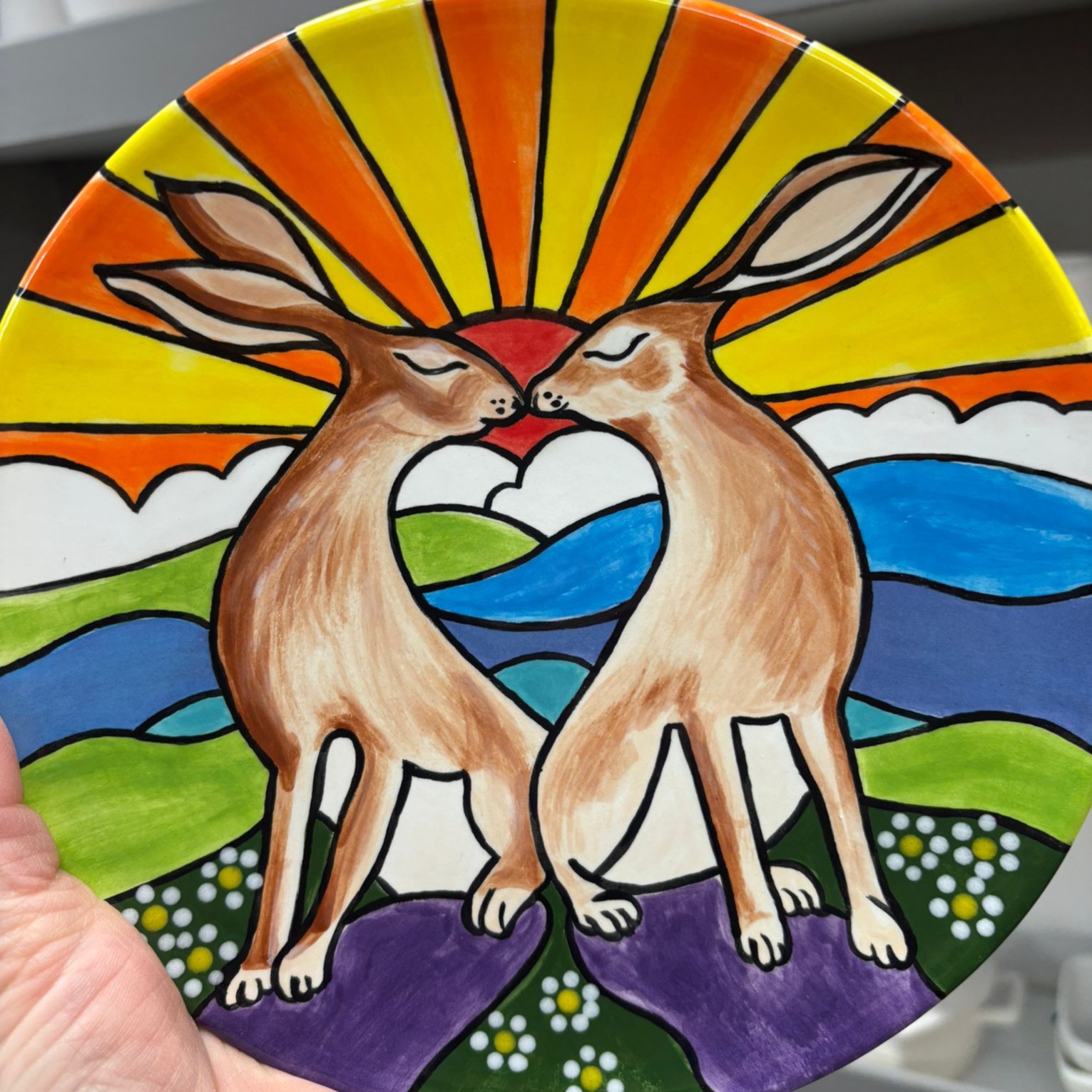Hand painted pottery plate featuring two kissing hares.